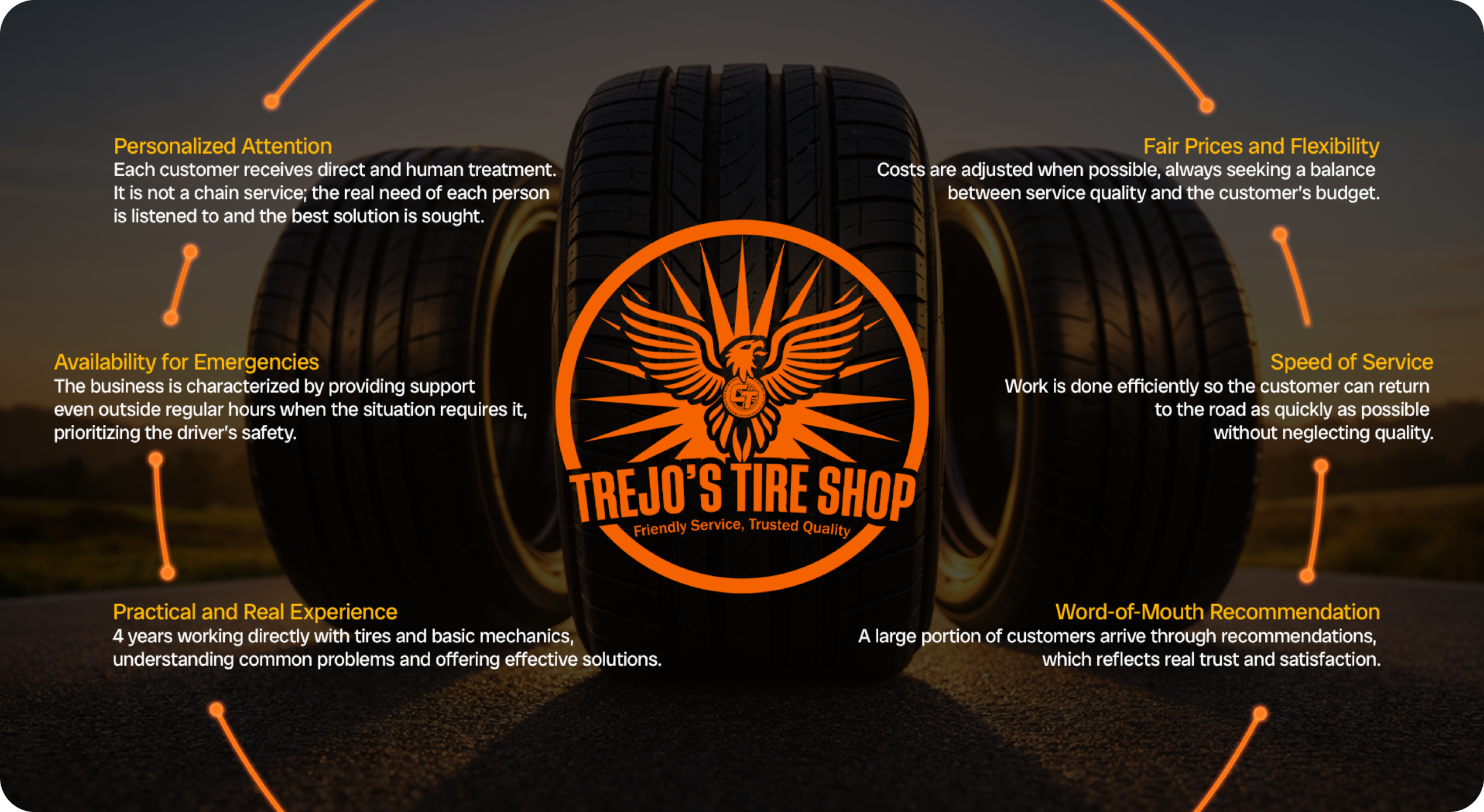 Those experiences became the starting point to create a different tire shop. I wanted to build a business where the customer would truly be attended, where their problem mattered, and where safety would always be the priority. That is how Trejo’s Tire Shop was born, with the objective of offering tire services and basic mechanic work with a human and honest approach. From the beginning, I set out to provide responsible service, even outside regular business hours, when a person arrives with a real emergency. For me, helping someone in a difficult situation is not just work, it is a commitment.